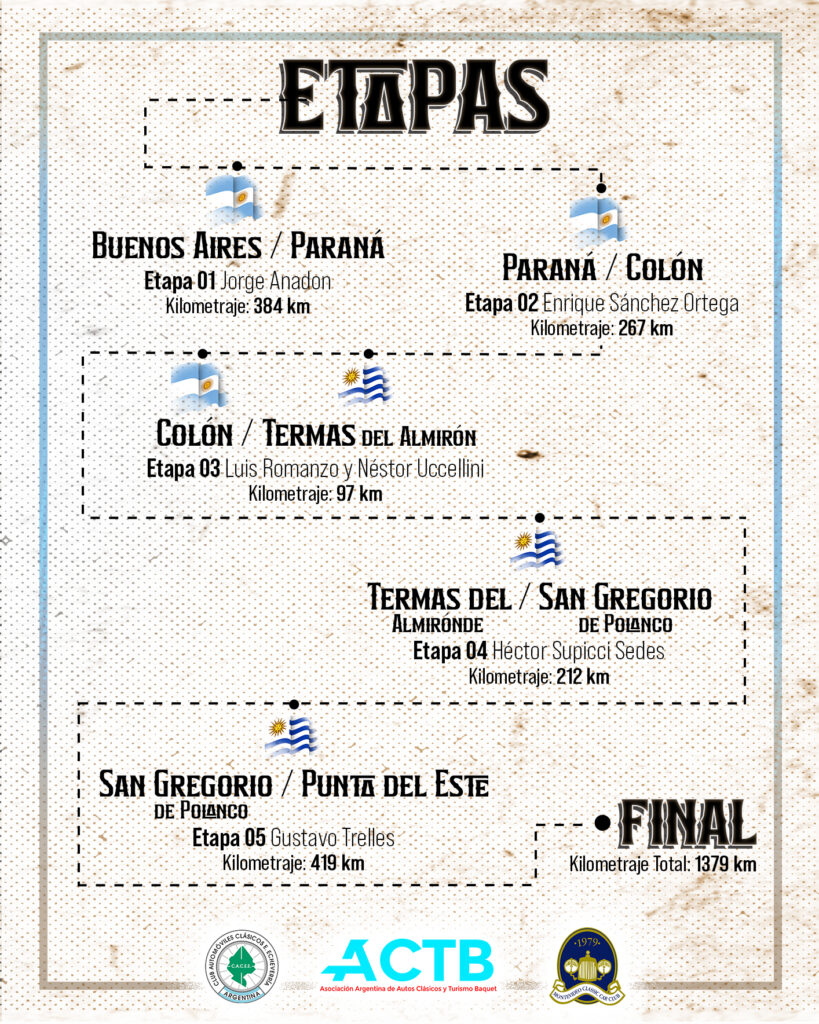 Se disfrutará cada jornada con encuentros entre amigos y la pasión por los autos que nos une. Habrá corredores de Argentina, Uruguay, Europa, Estados Unidos y otros países, todos compartiendo el mismo objetivo: disfrutar la ruta.